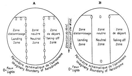 44. Every aerodrome shall be considered to consist of three zones when looking upwind. The right-hand zone shall be the taking-off zone, and the left-hand shall be the landing zone. Between these there shall be a neutral zone. An aeroplane when landing should attempt to land as near as possible to the neutral zone, but in any case on the left of any aeroplanes which have already landed. After slowing up or coming to a stop at the end of its landing run, an aeroplane will immediately taxi into the neutral zone. - Similarly an aeroplane when taking off shall keep as far as possible towards the right of the taking-off zone, but shall keep clear to the left of any aeroplanes which are taking off or about to take off.