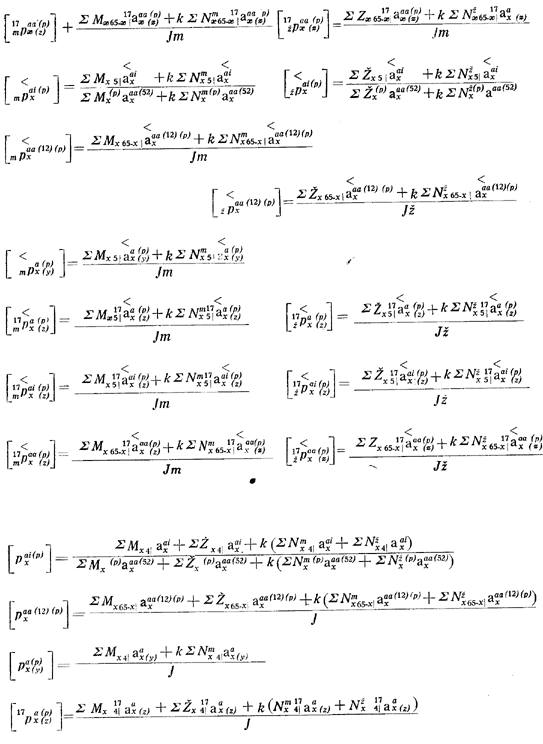 Jednotlivé složky pro výpočet hodnot pojistného jsou patrny ze vzorců uvedených na tab. XLIII, počítaných pro počáteční i budoucně do pojištění vstupující generace. Tabulka XLIV a XLV podává rozklad průměrného pojistného, počítaného podle uvedených vzorců pro všecky složky nárokové pro obě pohlaví.