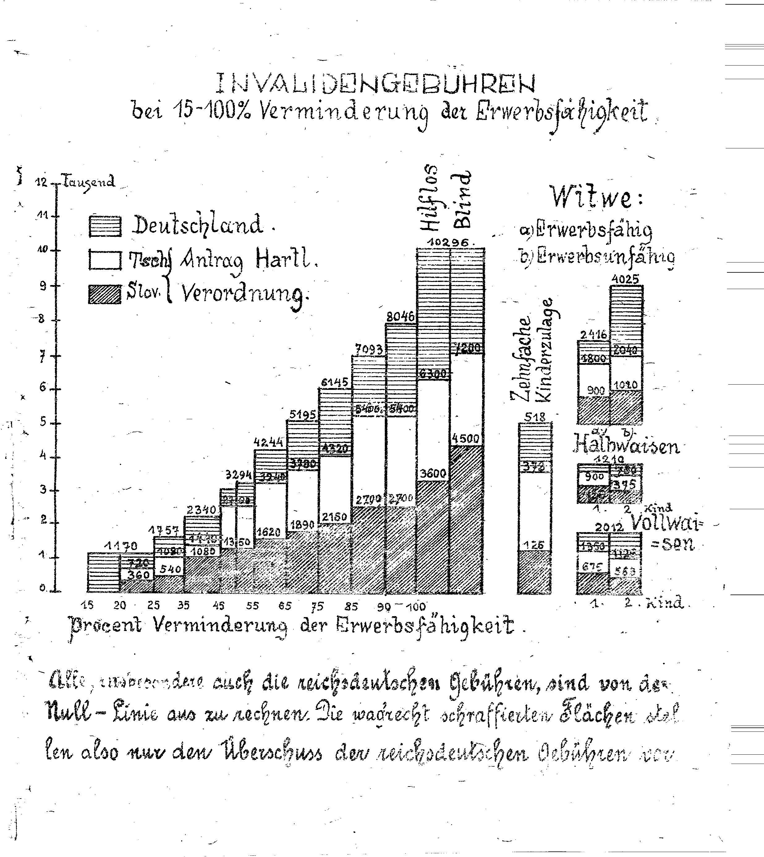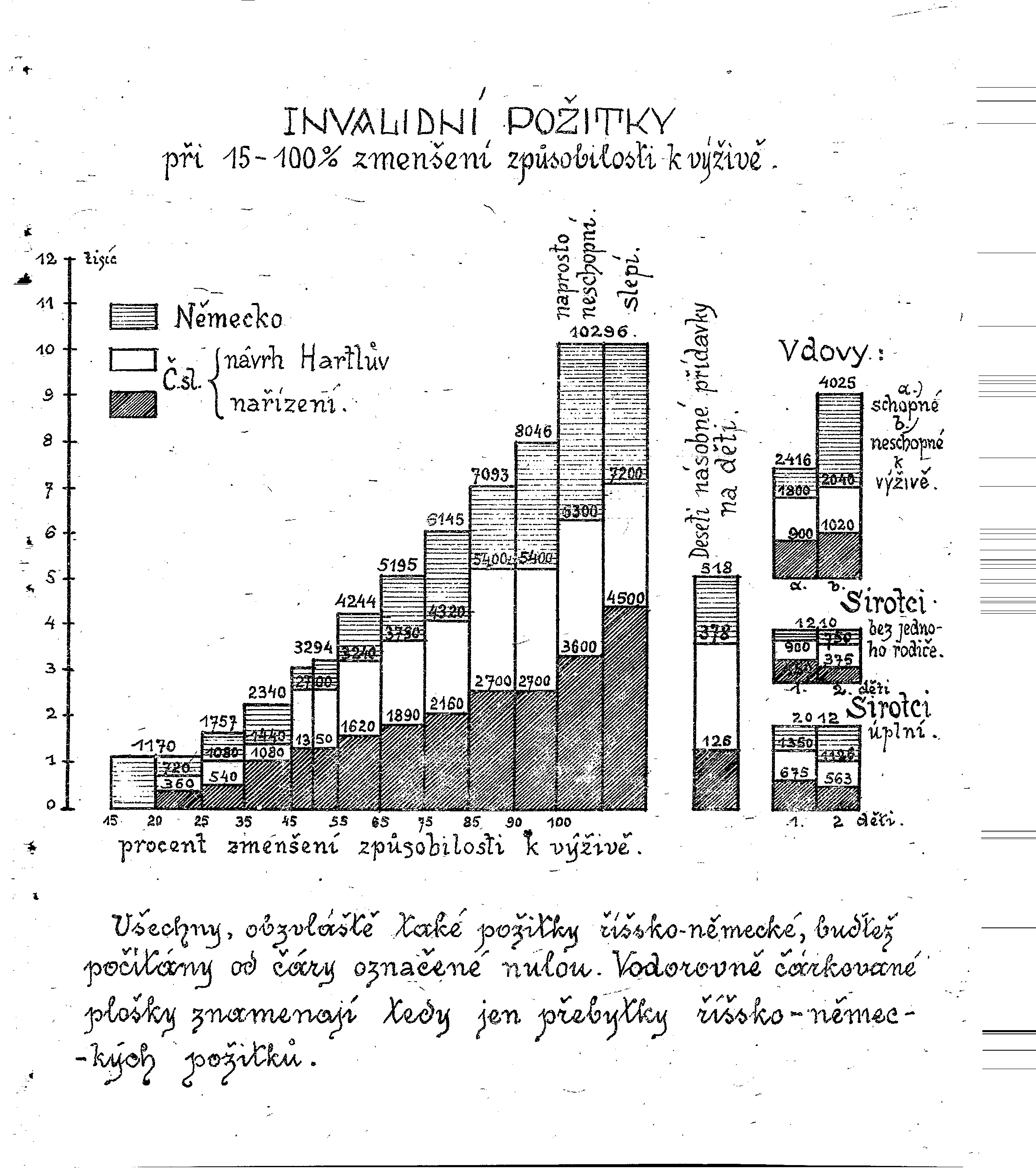 Aby byla osv>tlena cel÷ ot÷zka, bude prosp>ŷno porovnati invalidní požitky a požitky pozůstalých v naŷí republice a n>meckc tíŷi. K vůli jednoduchostí a ptehlednosti jest toto srovn÷ní provedeno v ptiložencm obrazci, v n>mž nyn>jŷí československc požitky jsou zn÷zorn>ny ŷediv> (č÷rkovan>), kdežto tíŷskon>meckc požitky*) vodorovn> č÷rkovanc. íŷskon>meckc požitky jsou ptepočít÷ny dle relace 1 marka = Kč 1,20.