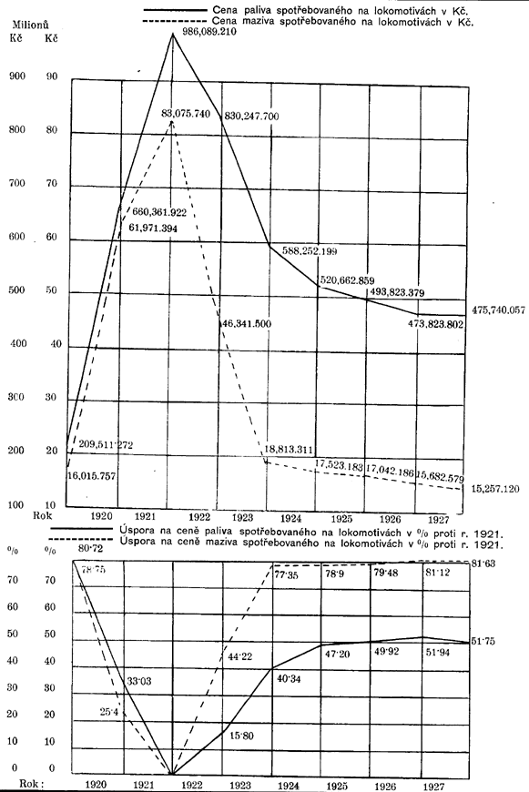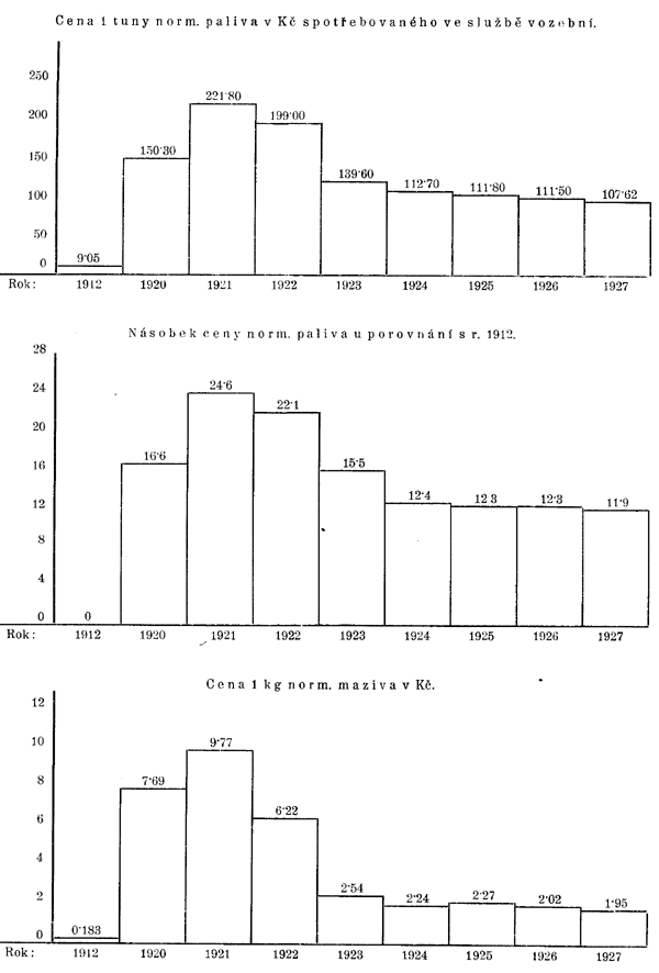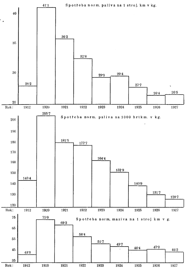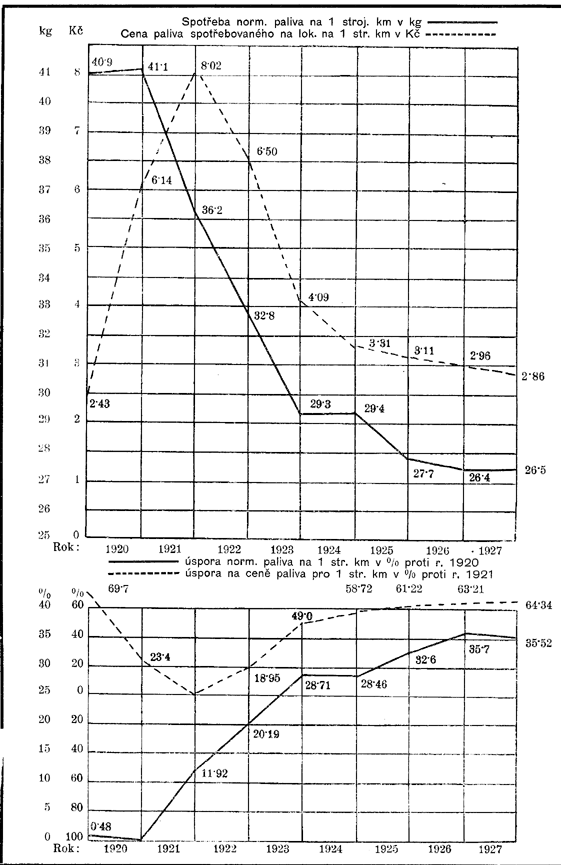 | Spotřeba norm. paliva na lokomotivách na 1.000 hrubých tunových kilometrů v kilogramech | 145,4 | 202,8 | 205,7 | 181,5 | 177v7 | 164,4 | 152,9 | 140,9 | 1317 | 128,7 |