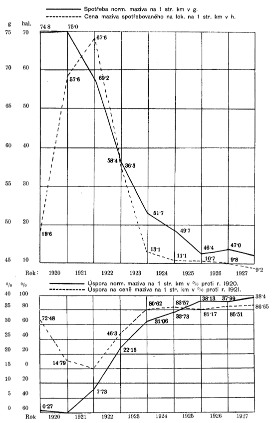 | Spotřeba norm. maziva na lokomotivách na 1 strojový kilometr v gramech | 43,3 | 74,8 | 75,- | 69,2 | 58,4 | 51,7 | 49,7 | 46,4 | 47,0 | 46,2 |