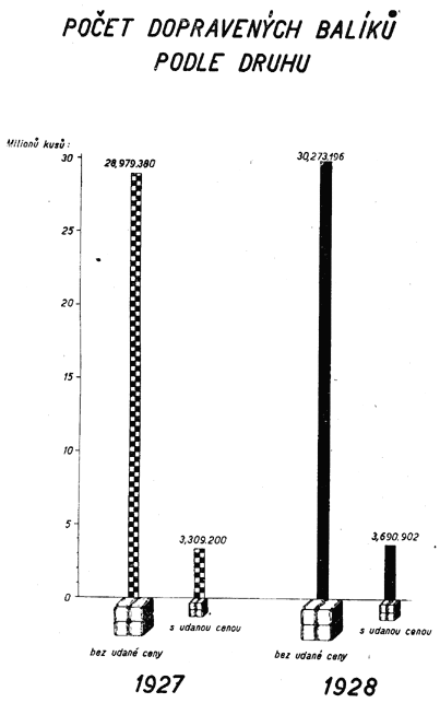 značí výslednou částku, o kterou systematická hospodárnost poštovní správy ulehčila etátnímu účtu státnímu v roce 1928 proti roku 1919, a to i při úhradě investičních potřeb z vlastních prostředků státu. Na tabulce XXVIII. jest pak graficky znázorněn vliv hospodaření Čsl. poštovní správy na etátní účet státu v letech 1919 až 1928.