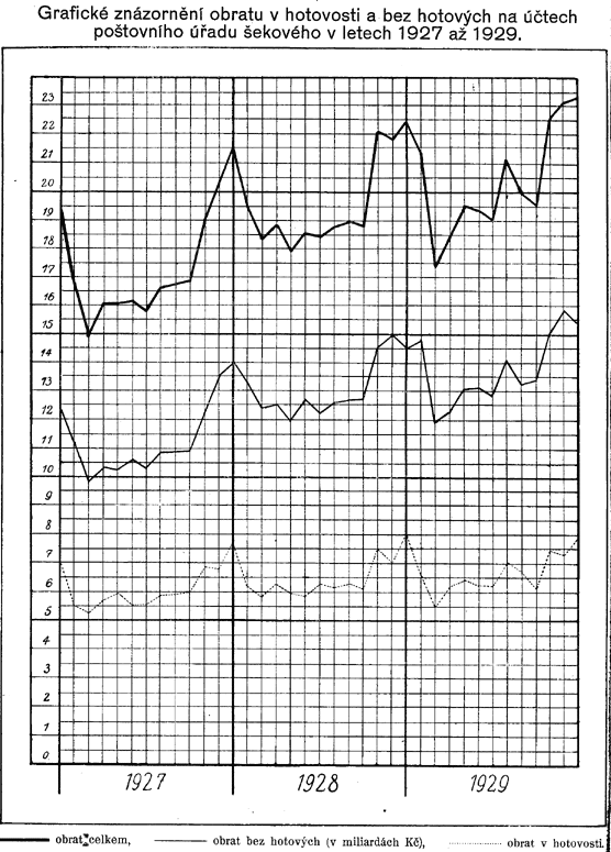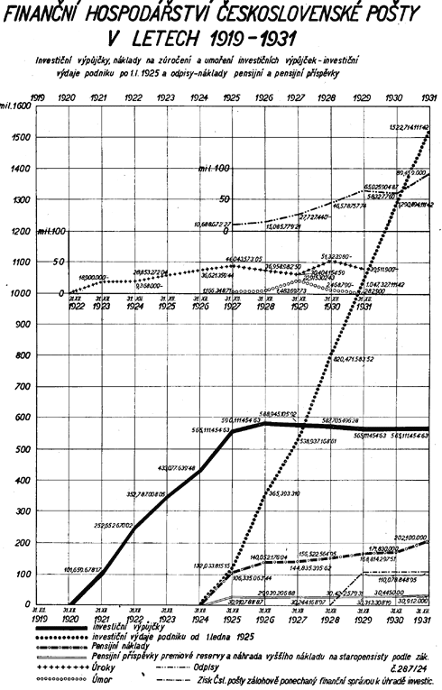 Mimo jmenované již diagramy zobrazují také diagramy na tabulkách č. XXXIII. až XXXVII. ostatní znaky, jež charakterisují vývoj finančního hospodářství Čsl. pošty, jakož i jeho předpoklady a výsledky.