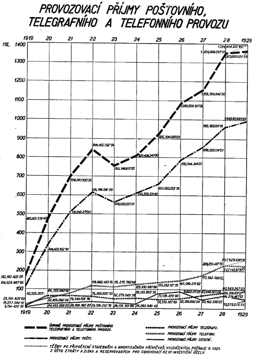 Z diagramu znázorňujícího vývoj finančního hospodářství Čsl. pošty (tab. č. XXXI.) jest přesvědčivě zřejmý trvalý vzestup těžeb, který byl přerušen toliko v r. 1923 a 1924 jednak v důsledku snížení některých poplatků poštovních telegrafních a telefonních, jednak proto, že všeobecně poklesla intensita poštovního, telegrafního a telefonního provozu důsledkem hospodářské krise, související s deflací. Deflace způsobila také první pokles nákladů Čsl. pošty (v r. 1922), které i v letech 1923 a 1924 rychle klesaly v důsledku trvalého uplatňování hospodárnosti poštovní správou, a byly by i v letech 1925 a 1926 poklesly, kdyby podnik nebyl převzal na svůj účet zejména pense a jiná nová břemena. Vzestup provozovacích nákladů v roce 1927 a 1928 souvisí se vzrůstem intensity dopravy, jest však daleko předstižen vzrůstem provozovacích příjmů. Naproti tomu v roce 1929 vzrůst provozovacích nákladů převýšil dosažený vyšší provozovací příjem, a to, jak již bylo zmíněno, v důsledku ochabnutí mimořádně příznivé hospodářské konjunktury let 1927 a 1928.