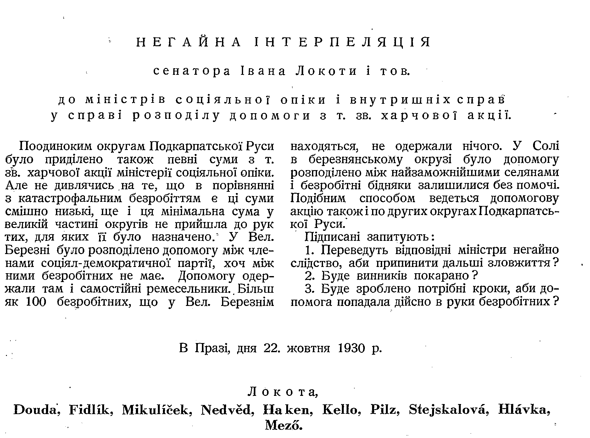 Jednotlivým okresům Podkarpatské Rusi byly přiděleny také určité částky z t. zv. stravovací akce ministerstva sociální péče. Ale nehledě k tomu, že jsou tyto částky směšně nízké, srovnáme-li je s katastrofální nezaměstnaností, ještě ani ta nejmenší částka ve většině okresů se nedostala do rukou těch, pro které byla určena. Ve Velkém Berezném byla podpora rozdělena mezi členy sociálně-demokratické strany, ačkoliv mezi nimi není nezaměstnaných. Výpomoc dostali i samostatní řemeslníci. Ve Velkém Berezném je více než 100 nezaměstnaných, ale ti nedostali nic.