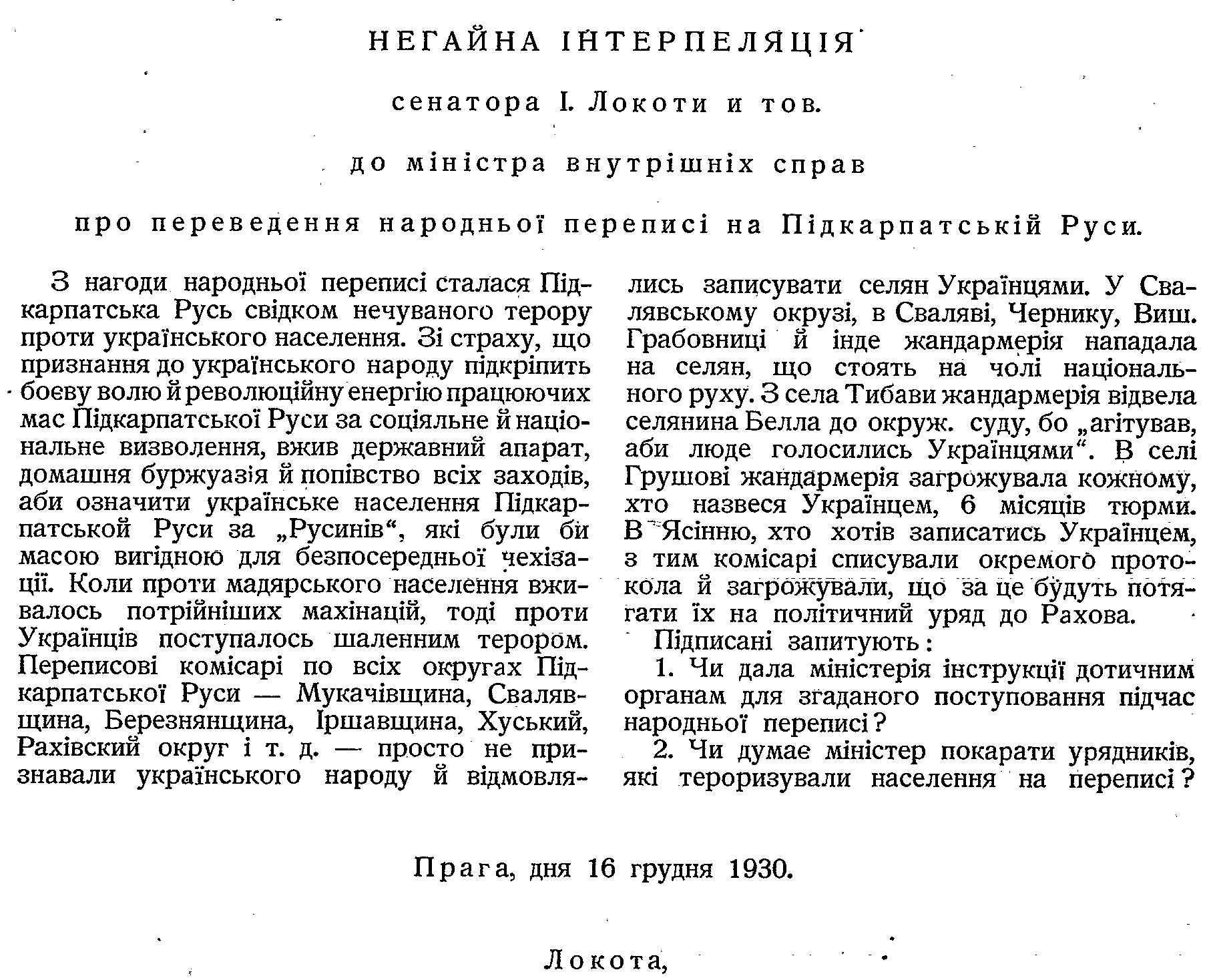 Při sčítání lidu stala se Podkarpatská Rus svědkem neslýchaného teroru proti ukrajinskému obyvatelstvu. Z obavy, že přiznání k ukrajinskému národu zesílí vůli k boji a revoluční energii pracujících mas Podkarpatské Rusi pro sociální a národní osvobození, užili státní aparát, domácí buržoasie a popové všech prostředků, aby ukrajinské obyvatelstvo Podkarpatské Rusi se označilo jako »Rusíni«, kteří by byli masou pohodlnou pro přímé počešťování. Užívalo-li se proti maďarskému obyvatelstvu otravných piklů, pak se proti Ukrajincům postupovalo se šíleným terorem. Sčítací komisaři ve všech okresích Podkarpatské Rusi - na Mukačevsku, Svalavsku, Iršavsku, v okrese chustském, rachovském atd. - prostě neuznávali ukrajinského národa a odpírali zapisovati vesničany jako Ukrajince. V svalavském okrese ve Svalavě, Černíku, Vyšní Hrabovnici a jinde četníci útočili na sedláky, stojící v čele národního hnutí. Z obce Tybavy četníci odvedli sedláka Bella k okresnímu soudu, poněvadž »agitoval, aby se lidé přihlašovali za Ukrajince«. V obci Hrušově četnictvo hrozilo každému, kdo by se nazval Ukrajincem, 6měsíčním žalářem. V Jasini kdo se chtěl zapsati jako Ukrajinec, s tím sčítací komisaři sepisovali zvláštní protokol a hrozili, že za to je budou obesílati k okresnímu úřadu v Rachovu.