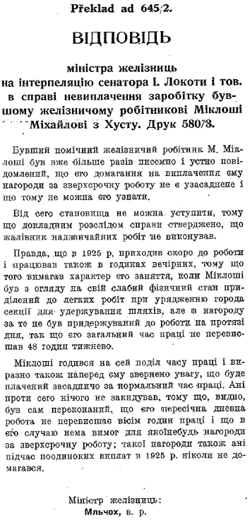 2. ministra železnic na interpelaci sen. Lokoty a soudr., že bývalému železničnímu dělníku Michalu Miklošovi v Chustu nebyl vyplacen plat (tisk 580/3)......................... str. 2