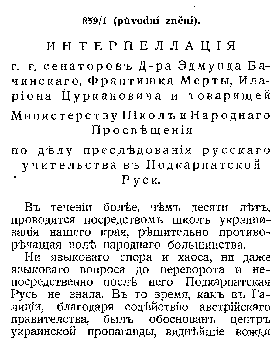 1. sen. dr Bačinského, Merty, Curkanoviče a druhů ministerstvu školství a národní osvěty o pronásledování ruských učitelů na Podkarpatské Rusi.