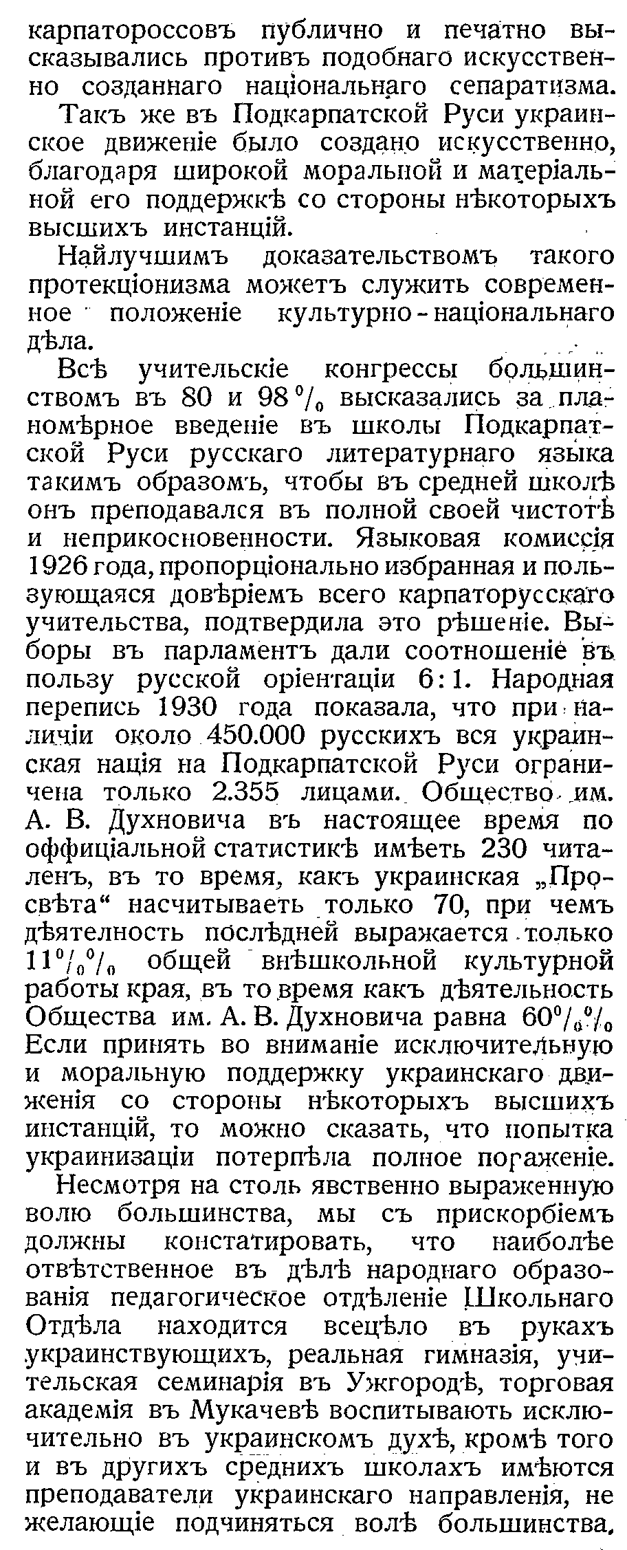 Všechny učitelské sjezdy většinou 80% a 98% prohlásily se pro soustavné zavedení ruského spisovného jazyka do škol na Podkarpatské Rusi tak, aby se ve střední škole vykládal v plné své čistotě a nedotknutelnosti. Jazykový výbor z roku 1926, poměrně zvolený a těšící se důvěře všeho karpatoruského učitelstva, potvrdil toto rozhodnutí. Volby do Národního shromáždění poskytly poměr 6:1 ve prospěch ruské orientace. Soupis lidu v r. 1930 ukázal, že při počtu asi 450.000 Rusů celý ukrajinský národ na Podkarpatské Rusi jest omezen jen na 2.355 osob. Spolek A. V. Duchnoviče má nyní podle úřední statistiky 230 čítáren, zatím co ukrajinská »Prosvita« jich má jen 70, při čemž se její činnost vyjadřuje jen 11% veškeré mimoškolní kulturní práce v zemi, zatím co činnost spolku A. V. Duchnoviče rovná se 60%. Přihlížíme-li k výlučné materiální a morální podpoře ukrajinského hnutí některými vyššími instancemi, můžeme říci, že pokus o poukrajinštění úplně ztroskotal.
