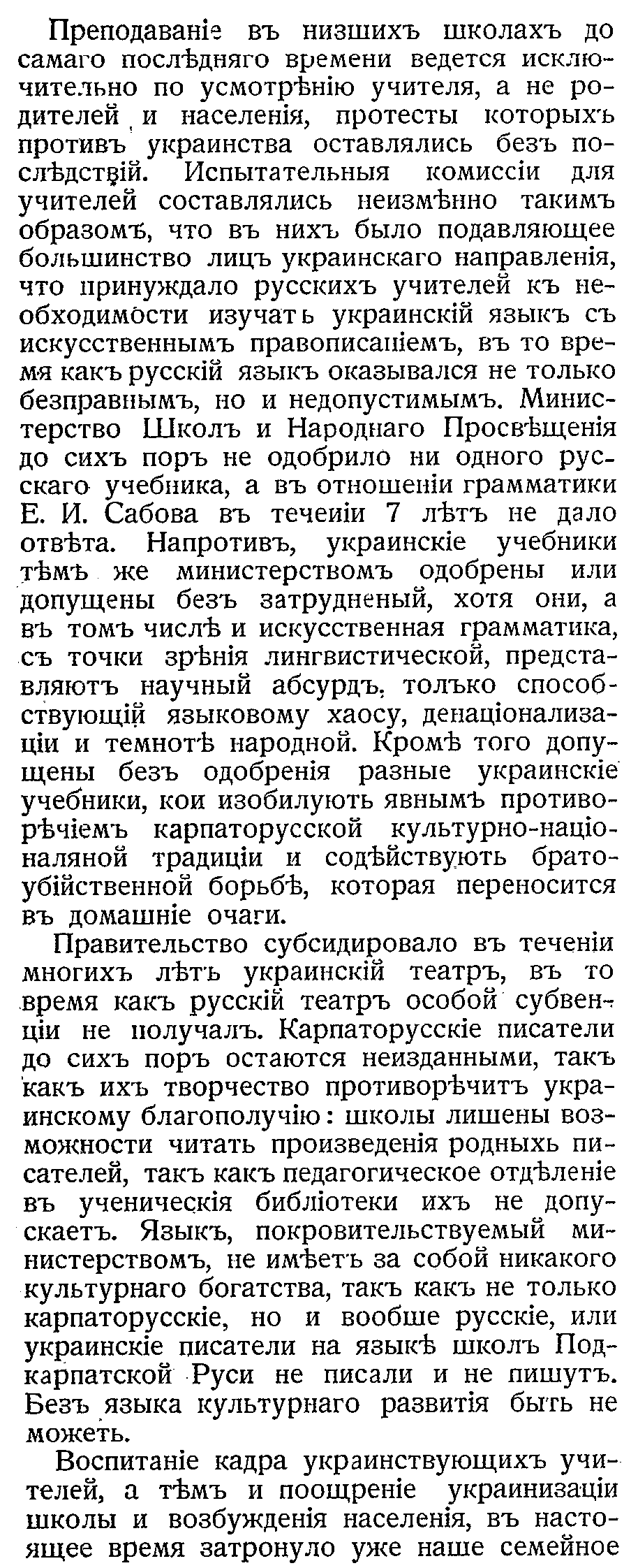 Vyučování v nižších školách do poslední doby vedlo se výlučně podle rozhodnutí učitele a nikoli rodičů a obyvatelstva, jejichž protesty proti poukrajinšťování byly bezvýsledné. Zkušební komise pro učitele sestavovaly se nezměnitelně tak, že v nich byla převážná většina osob ukrajinského směru a proto ruští učitelé byli nuceni učiti se ukrajinskému jazyku s umělým pravopisem, zatím co ruský jazyk byl nejen bezprávný, nýbrž i nepřípustný. Ministerstvo školství a národní osvěty dosud neschválilo ani jedinou ruskou učebnici, a pokud jde o mluvnici E. I. Sabova, nedalo za 7 let odpovědi. Naopak totéž ministerstvo schvaluje nebo připouští ukrajinské učebnice bez překážek, ačkoliv ony a mezi nimi i umělá mluvnice jsou s hlediska jazykozpytu vědeckým absurdem, pomáhajícím jen jazykovému zmatku, odnárodňování a zatemnělosti lidu. Mimo to jsou bez schválení připuštěny rozličné ukrajinské učebnice, které oplývají zřejmými odpory proti karpatoruské kulturní a národní tradici a nepřímo pomáhají bratrovražedné válce, která se přenáší k domácím krbům.