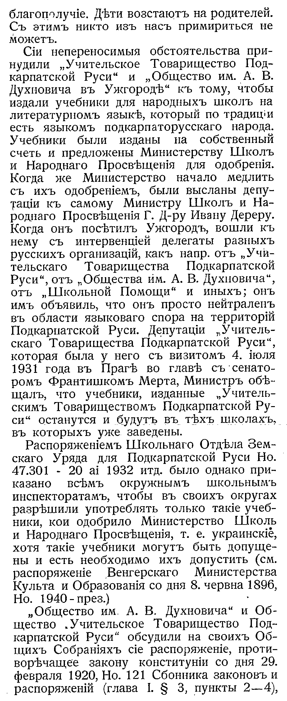 Rozhodnutím školního oddělení zemského úřadu pro Podkarpatskou Rus, č. 47.301-20 ai 1932 atd. bylo však přikázáno všem okresním školním inspektorátům, aby ve svých obvodech dovolovaly užívati jen takových učebnic, které schválilo ministerstvo školství a národní osvěty, t. j. ukrajinských, ačkoliv takové učebnice mohou a musí býti připuštěny (viz nařízení uherského ministerstva kultu a vyučování ze dne 8. června 1896, č. 1940 pres.).
