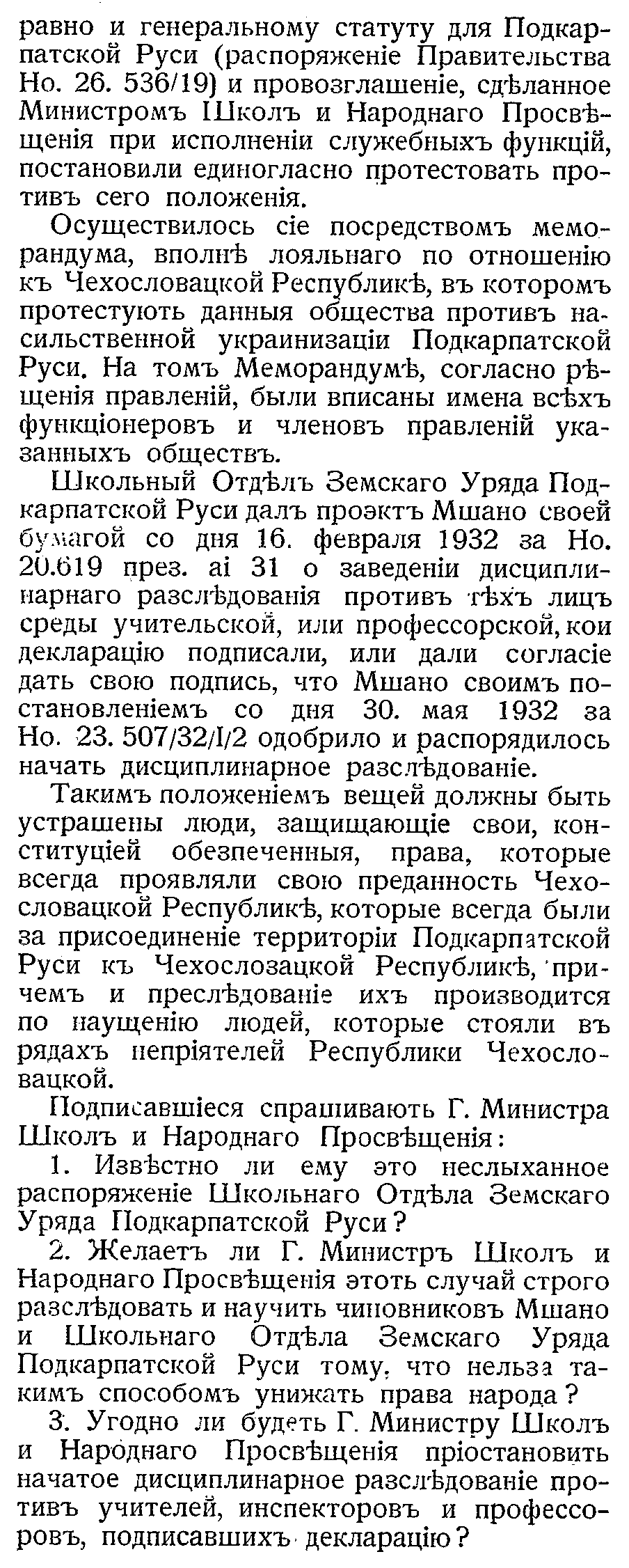 Nehledíce k tak zřejmě projevené vůli většiny, s politováním musíme konstatovati, že pedagogické oddělení školního oddělení, nejodpovědnější ve věcech národní osvěty, jest úplně v rukou přívrženců ukrajinského směru, reálné gymnasium a učitelský ústav v Užhorodě, jakož i obchodní akademie v Mukačevě vychovávají pouze v ukrajinském duchu a mimo to i v jiných středních školách jsou profesoři ukrajinského směru, kteří si nepřejí podříditi se vůli většiny.