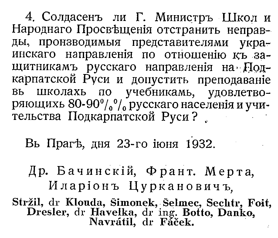 4. Hodlá-li pan ministr školství a národní osvěty opraviti nepravdy, uváděné zástupci ukrajinského směru vůči ochráncům ruského směru na Podkarpatské Rusi a dovoliti, aby se ve školách vyučovalo podle učebnic, které vyhovují 80-90% ruského obyvatelstva a učitelstva na Podkarpatské Rusi?
