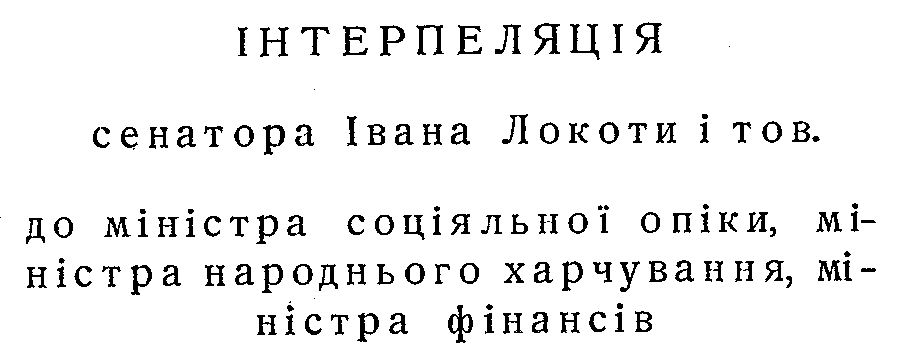 2. sen. Lokoty a soudr. ministrovi sociální péče, ministrovi pro zásobování lidu a ministrovi financí o rychlé pomoci hladovějícím na Zakarpatí a o zneužití pomocné akce.
