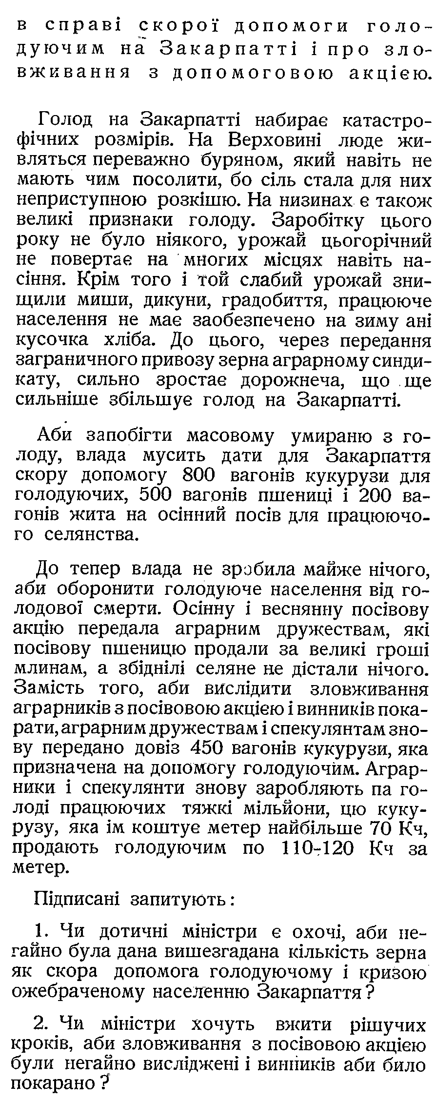 Hlad na Zakarpatí dosahuje katastrofálních rozměrů. Na Verchovině se lidé živí převážně buřanem, jejž nemají dokonce čím osoliti, neboť sůl se stala pro ně nedostupným přepychem. V nížinách jsou rovněž velké příznaky hladu. Výdělek letos nebyl žádný, letošní sklizeň nevrací na četných místech ani osiva. Kromě toho i tuto slabou úrodu zničily myši, divoká zvířata, krupobití a pracující obyvatelstvo nemá na zimu zajištěný ani kus chleba. Mimo to, jelikož dovoz obilí z ciziny byl odevzdán agrárnímu syndikátu, silně vzrůstá drahota, což ještě více zvětšuje hlad na Zakarpatí.