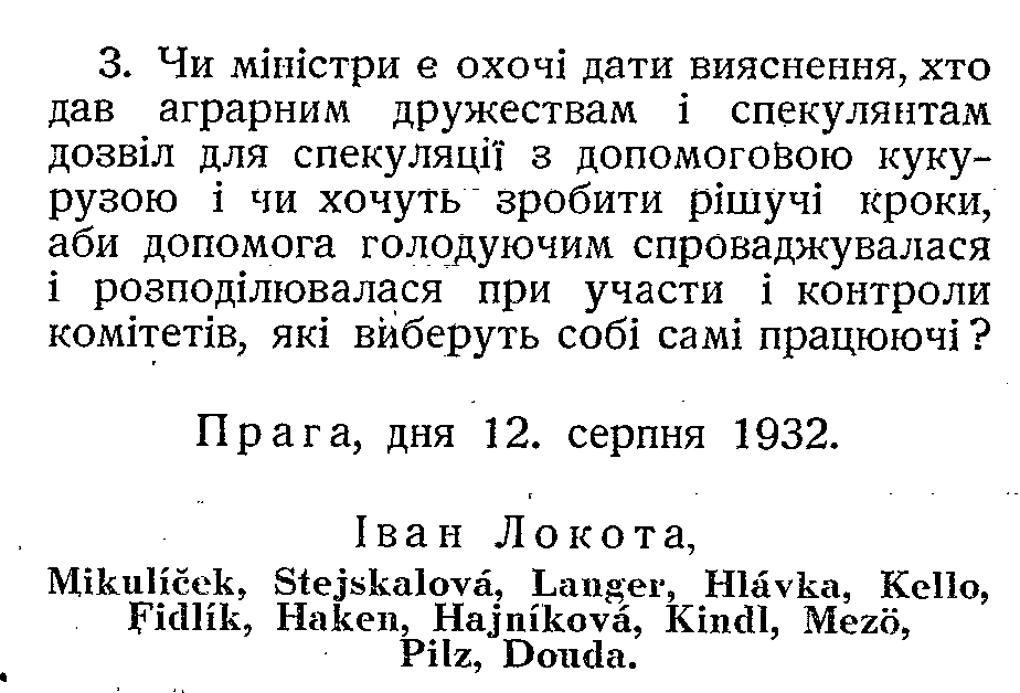 3. Jsou-li ministři ochotni vysvětliti, kdo dovolil agrárním družstvům a spekulantům spekulovati s kukuřicí, určenou na výpomoc, a jsou-li ochotni rozhodně zakročiti, aby výpomoc pro hladovějící se dovážela a rozdělovala za účasti a kontroly výborů, které si zvolí sami pracující?