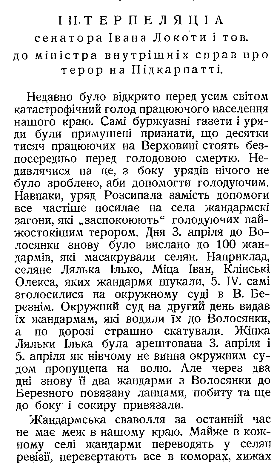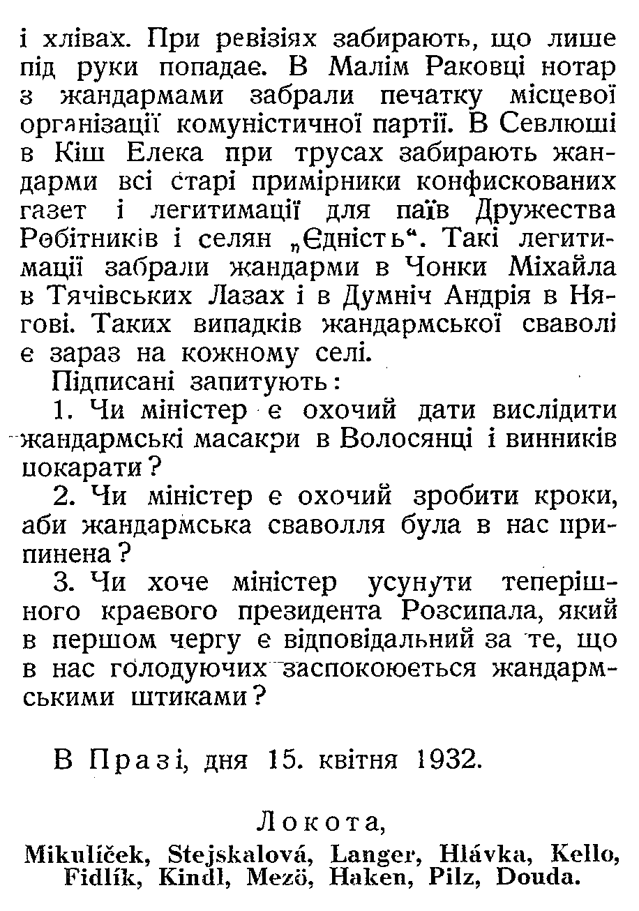 Nedávno byl před celým světem vylíčen katastrofální hlad pracujícího obyvatelstva naší země. Samy buržoasní časopisy a úřady byly nuceny uznati, že desetitisíce pracujících na Verchovině čeká přímo smrt hladem. Bez ohledu na to úřady nic neudělaly, aby pomohly hladovějícím. Naopak Rozsypalův úřad místo aby pomohl, ještě častěji posílá do obcí četnické výpravy, které >uspokojují< hladovějící nejostřejším terorem. Dne 5. dubna bylo zase do Volosianky vysláno asi 100 četníků, kteří masakrovali sedláky. Na příklad sedláci Ilko Lalka, Ivan Mica, Olexa Klinský, které hledali četníci, sami se dne 5. dubna přihlásili u okresního soudu ve Velkém Berezném. Okresní soud je příštího dne vydal četníkům, kteří je vedli do Volosianky a po cestě je strašně ztýrali. Manželka Ilka Lalky byla zatčena 3. dubna a 5. dubna ji soud jako úplně nevinnou propustil na svobodu. Ale za dva dny ji znovu dva četníci vedli z Volosianky do Berezného svázanou řetězy, ztlučenou a ještě jí přivázali po straně i sekeru.