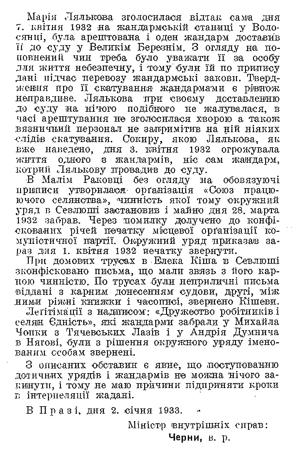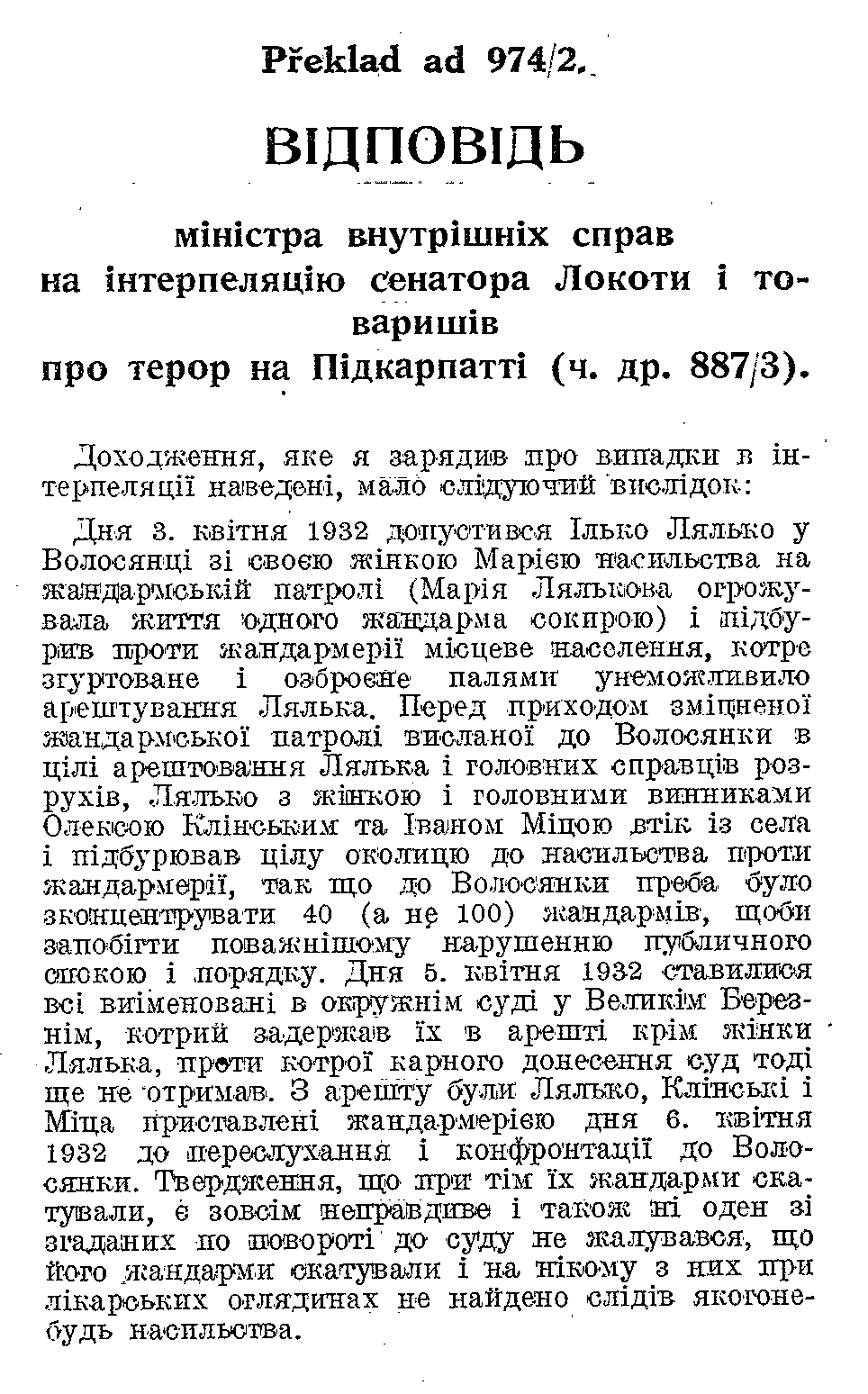 Dne 3.dubna 1932 dopustil se Ilko Lálko ve Volosiance spolu se svou žennou Marií násilí na četnické hlídce (Marie Lálková ohrožovala při tom jednoho četníka na životě sekerou) a popudil proti četnictvu místní obyvatelstvo, které shluknuvši se a ozbrojeno kůly znemožnilo Lálkovo zatčení. Před příchodem sesílené četnické hlídky, vyslané do Volosianky, aby zatkla Lálka a hlavní původce výtržností, Lálko se ženou a s hlavními vinníky Olexou Klimským a Ivanem Mico uprchl z obce a štval celé okolí k násilným činům proti četnictvu, takže do Volosianky bylo nutno soustřediti 40 (a nikoliv 100) mužů četnictva, aby se předešlo vážnějšímu porušení veřejného klidu a pořádku. Dne 5. dubna 1932 dostavili se všichni jmenovaní k okresnímu soudu ve Velkém Berezném, který je ponechal ve vazbě mimo Lálkovu manželku, prosti níž trestní oznámení soudu tehdy ještě nedošlo. Z vazby byli Lálko, Klimský a Mico předvedeni četnictvem dne 6. dubna 1932 k výslechu a ke konfrontaci do Volosianky. Tvrzení, že bytí při tom četnictvem ztýráni, je zcela nepravdivé a také žádný ze jmenovaných si po návratu k soudu nestěžoval, že byl ztýrán četnictvem, ani nebyly na žádném z nich nalezeny při lékařské prohlídce stopy nějakého násilí.