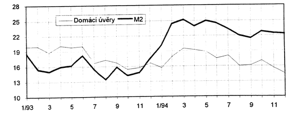 M25 vzrostla v roce 1994 o 22,1 % na 877,2 mld Kč. Vývoj