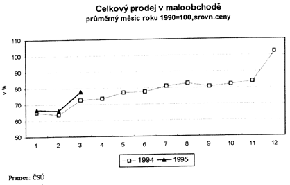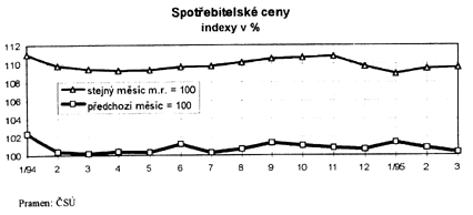 Po urychlení cenového růstu v lednu 1995 došlo v únoru a zejména v březnu k výraznému uklidnění. Cenový růst v lednu i únoru byl způsoben především růstem cen potravin i cen veřejného stravování. Hladina spotřebitelských cen se v průbu 1. čtvrtletí zvýšila o 2,5 % (březen 1995 proti prosinci 1994). Pozitivní je tendence k poklesu klouzavé roční míry inflace (průměr posledních 12 měsíců proti průměru předchozích 12 měsíců).