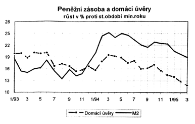 Pro budoucí vývoj inflace je významným faktorem postupné zmírňování dynamiky peněžní zásoby M2. Proti meziročnímu indexu na konci roku 1994 (122,3 %) došlo na konci 1. čtvrtletí ke snížení o 3,4 procentního bodu na 118,9 %.