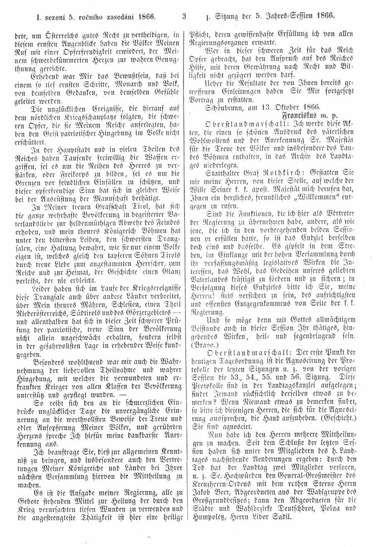 Nacházíte se: Digitální knihovna › Sněm království Českého 1861-1866 › Stenoprotokoly › 1. schůze › Pondělí 19. listopadu 1866