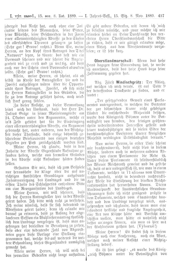 Nacházíte se: Digitální knihovna › Sněm království Českého 1889-1895 › 1. zasedání › Stenoprotokoly › 15. schůze › Pátek 8. listopadu 1889