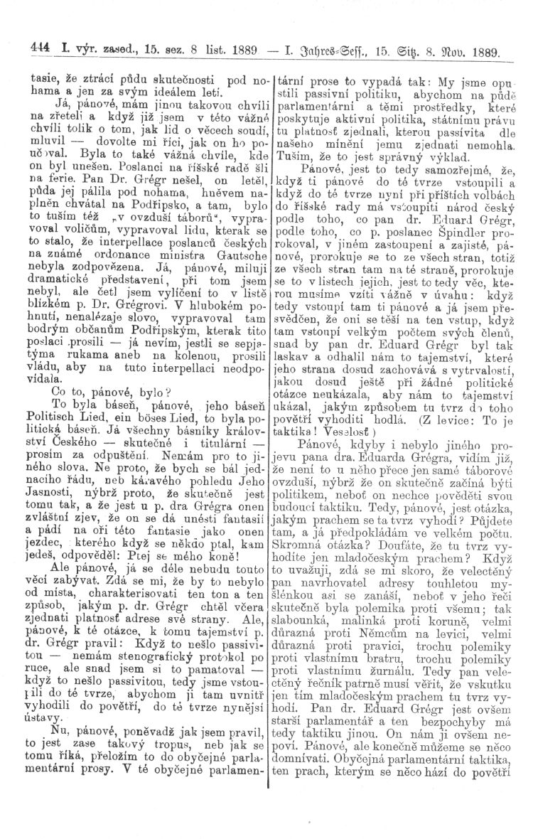 Nacházíte se: Digitální knihovna › Sněm království Českého 1889-1895 › 1. zasedání › Stenoprotokoly › 15. schůze › Pátek 8. listopadu 1889
