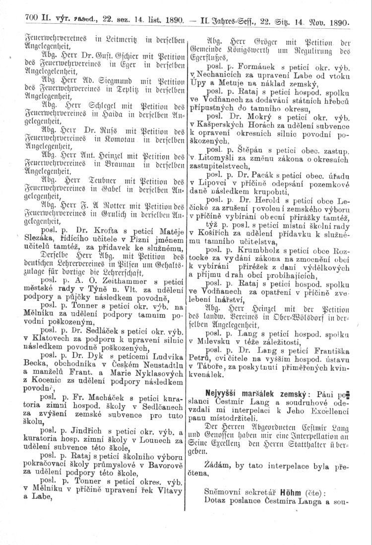 Nacházíte se: Digitální knihovna › Sněm království Českého 1889-1895 › 2. zasedání › Stenoprotokoly › 22. schůze › Pátek 14. listopadu 1890