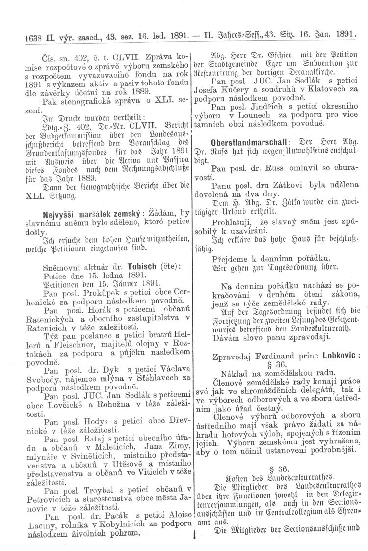Nacházíte se: Digitální knihovna › Sněm království Českého 1889-1895 › 2. zasedání › Stenoprotokoly › 43. schůze › Pátek 16. ledna 1891