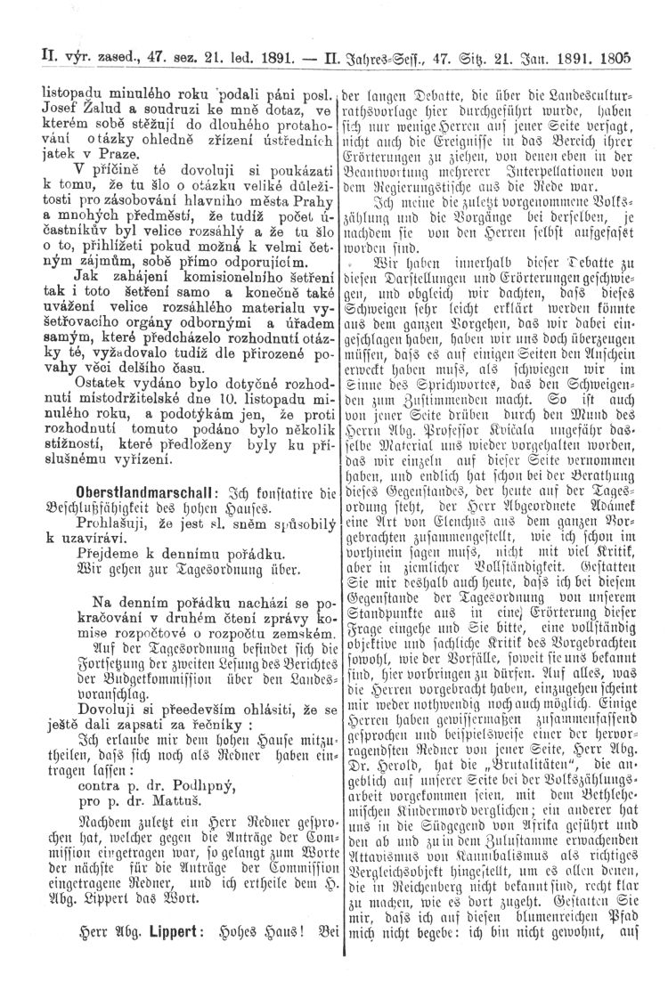 Nacházíte se: Digitální knihovna › Sněm království Českého 1889-1895 › 2. zasedání › Stenoprotokoly › 47. schůze › Středa 21. ledna 1891