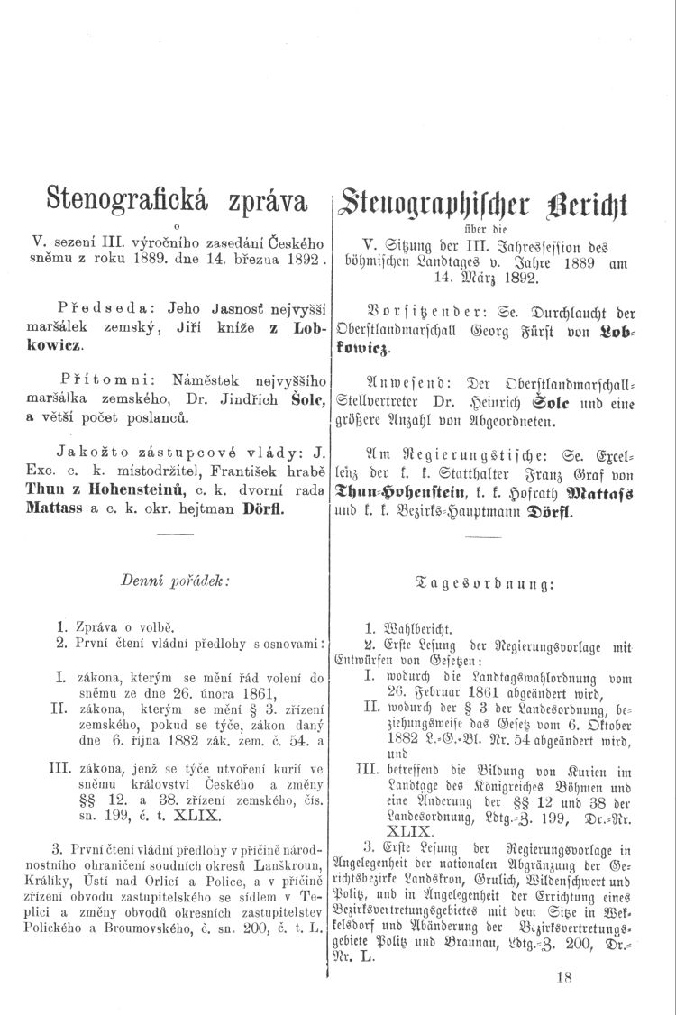Nacházíte se: Digitální knihovna › Sněm království Českého 1889-1895 › 3. zasedání › Stenoprotokoly › 5. schůze › Pondělí 14. března 1892