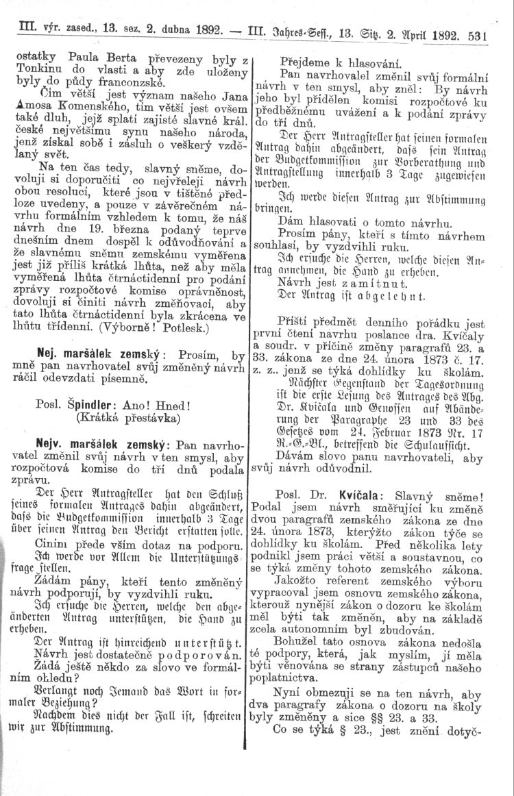 Nacházíte se: Digitální knihovna › Sněm království Českého 1889-1895 › 3. zasedání › Stenoprotokoly › 13. schůze › Sobota 2. dubna 1892