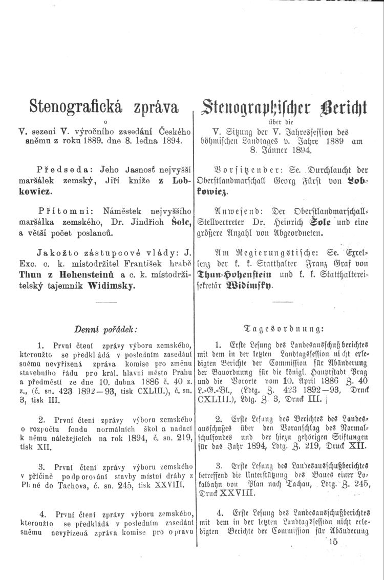 Nacházíte se: Digitální knihovna › Sněm království Českého 1889-1895 › 5. zasedání › Stenoprotokoly › 5. schůze › Pondělí 8. ledna 1894