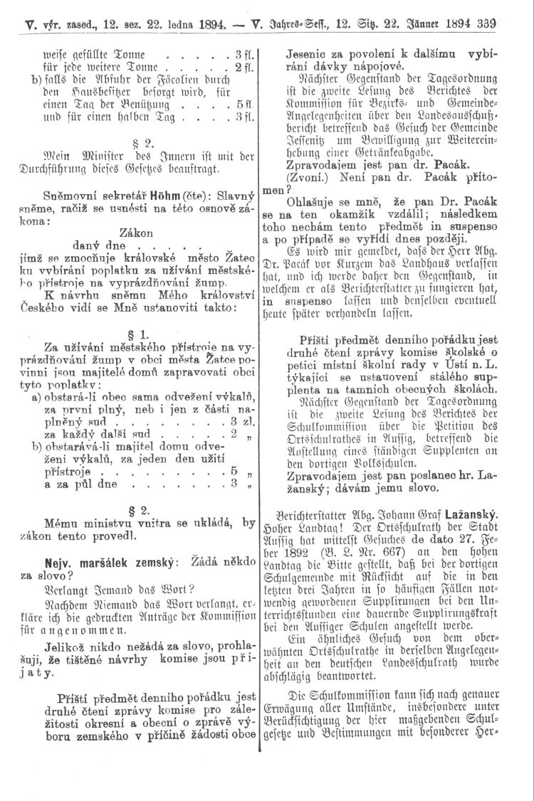 Nacházíte se: Digitální knihovna › Sněm království Českého 1889-1895 › 5. zasedání › Stenoprotokoly › 12. schůze › Pondělí 22. ledna 1894