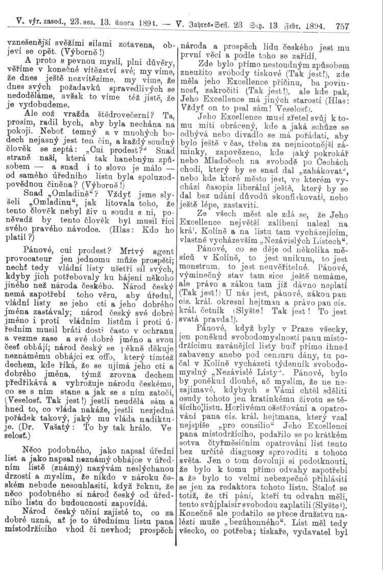 Nacházíte se: Digitální knihovna › Sněm království Českého 1889-1895 › 5. zasedání › Stenoprotokoly › 23. schůze › Úterý 13. února 1894