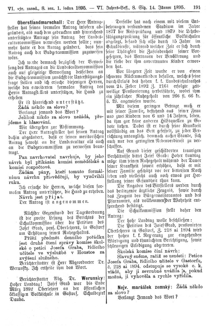 Nacházíte se: Digitální knihovna › Sněm království Českého 1889-1895 › 6. zasedání › Stenoprotokoly › 8. schůze › Pondělí 14. ledna 1895