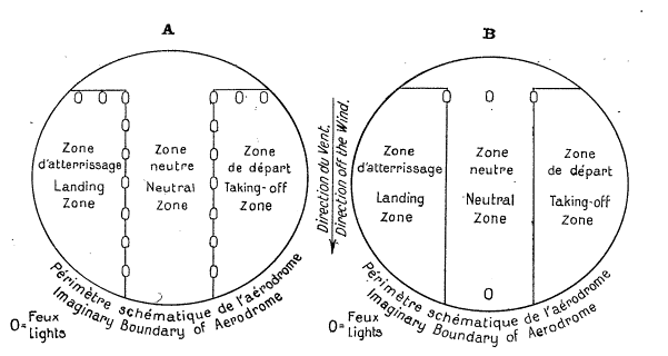 44. Tout aérodrome sera virtuellement divisé en trois zones pour un observateur placé face au vent. La zone de droite sera la zone de départ et la zone de gauche, celle d'atterrissage; entre ces deux zones, il y aura une zone neutre. Un avion voulant atterrir devra le faire aussi près que possible de la zone neutre, mais en se plaçant à la gauche de tout autre avion qui aurait déjà atterri. Ayant ralenti sa marche ou ayant fini de rouler sur le sol, l'avion se rendra immédiatement dans la zone neutre. De même, un avion qui s'enlève, le fera dans la partie la plus à droite de la zone de départ, tout en se maintenant franchement à gauche de tout autre avion en train de s'enlever ou sur le point de le faire.
