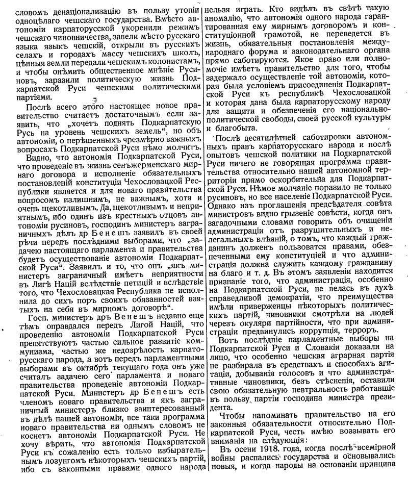 "Durch den Friedensvertrag von St. Germain en Laye ist mitten in Europa ein Staat entstanden, der neben rund 6 1/2 Millionen Èechen unter anderen auch 3 1/2 Millionen Deutsche umfaßt. Vergebens waren alle Vorstellungen, welche wir, die Vertreter der Sudetendeutschen vor Beginn und während des Verlaufes der Friedensverhandlungen erhoben haben, vergebens war unser einmütiges Bestreben, das Schicksal unseres Siedlungsgebietes selbst zu bestimmen, vergebens haben wir darauf hingewiesen, daß ein so gestalteter Staat, nicht den 14 Punkten Wilsons, nicht dem Begriffe der Demokratie entspräche, daß er niemals zur Ruhe kommen könnte und schon infolge seiner unmöglichen Zusammensetzung eine stete Bedrohung des europäischen Friedens bilden würde."