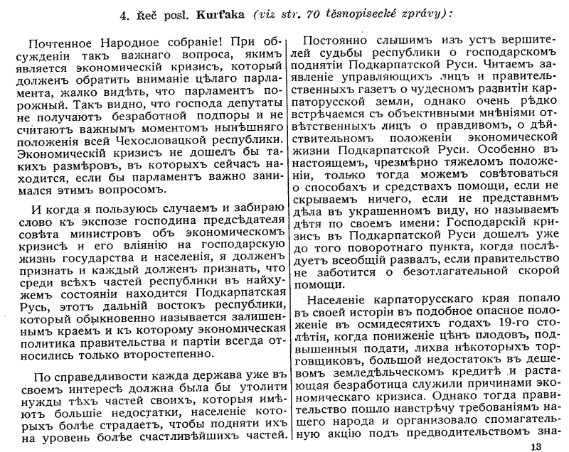 A kormányexpozé a modern gazdasági politika alapelveként jelöli meg nagyon helyesen a gyengék véde!mét, támogatását és súlyos anyagi helyzetük figyelembe vételét. De ennek éppen az ellenkezője történik. Hallottunk arról és olvastunk, hogy Fürstenbergéknek 76 millió vagyondézsmából csak 29 milliót kellett megfizetniök. Ugyanezt mondják Schönbornról is, aki sok milliót kitevő adóelengedést kapott, hogy annál kedvezőbb feltételek mellett legyen hajlandó átengedni mamutbirtokát a Latoricatársaságnak. Annak a Latorica-társaságnak, amely nemrégiben bocsátotta el egész tömegét a tisztviselőknek, altiszteknek és más munkásoknak, hogy éhező, gondokkal küzdő proletárokká tegye őket. De hallottunk Koburgék nagy adóelengedéséről, sőt arról is, hogy Baának nemrégiben 40 millió adót engedtek el. Arról pedig mindenki tud, hogy a nagybankok 300 milliót kaptak szanálás céljaira, azok a nagybankok, amelyek egymás után nyelik el Szlovenszkó és Ruszinszkó kisebb bankjait. Csak nemrég történt, hogy elnyelték Szlovenszkó egyik legnagyobb bankját, a Szlovák Általános Hitelbankot. Ugyanakkor a Bereg-Munkácsi Takarékpénztárt is. Most a Böhmische Eskompte Bank Kassa egyik legrégibb, jónevü intézetét, a Kassai Bankot ette meg szőröstül bőröstül. Ugyancsak most készült el a Legióbank a rózsahegyi Általános Bank elfogyasztásával.