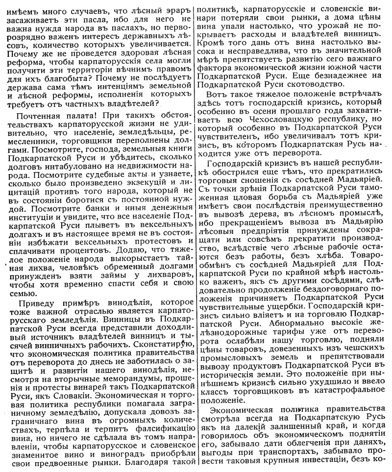 Sietek felhívni a kormány nagybecsü figyelmét a bortermelésnél a fogyasztási adók lehetetlen és tarthatatlan voltára, ahol például ezidén Beregszász vidékén sokan adták el mustjukat azért az árért, amennyit fogyasztási adóba kell fizetniök, vagyis 1ˇ60 koronáért literenként. Ha egy terményre oly összegü közvetlen adót kell fizetni, mint amennyibe a termelvény kerül és ha azt a közvetett adók egész serege követi, akkor természetesen csődbe kell jutnia a termelésnek, mint ahogy a szőlőtermelés máris a csőd szélén áll.