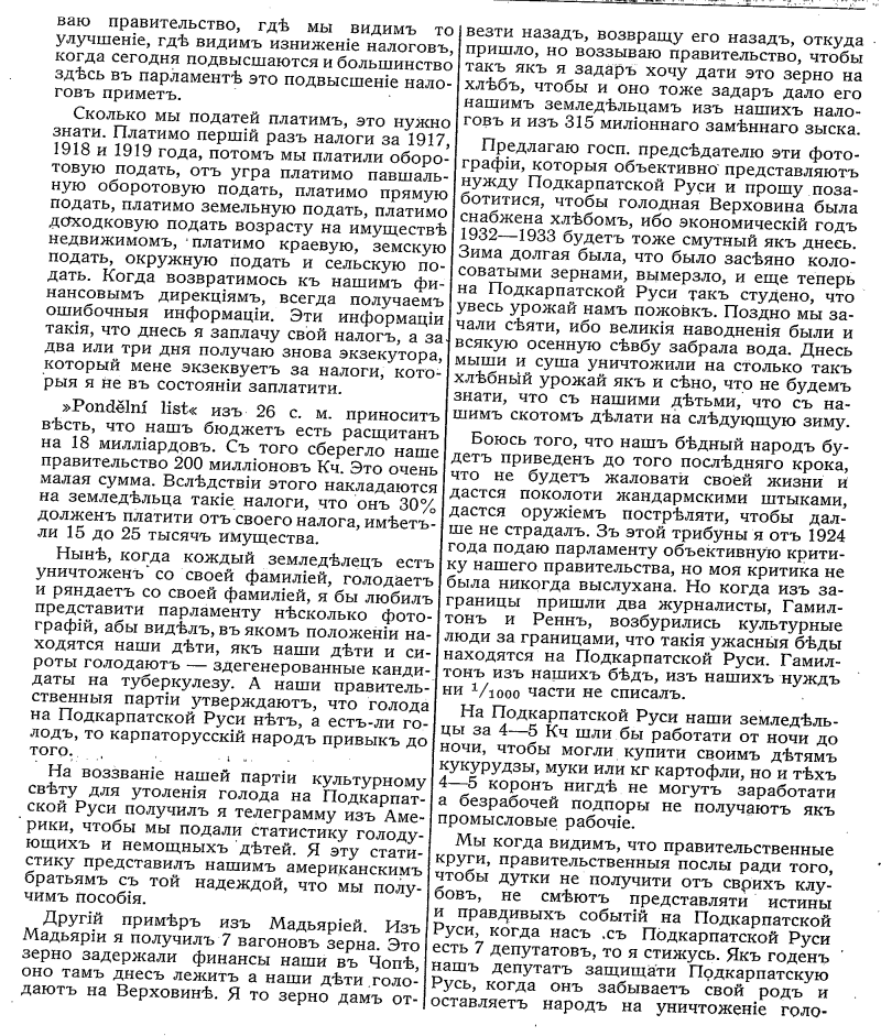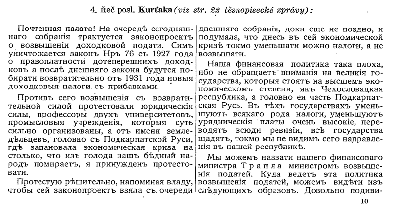Zur Illustrierung dieser Behauptung möchte ich nur anführen, daß zu den jetzt stattfindenden Sokolfestlichkeiten von staatswegen Riesensummen beigetragen werden. So hat allein der Staat zur Errichtung des Sokolstadions in Prag 23 Millionen Kronen geopfert. Das Gesundheitsministerium hat für das Sokolfest alein 7 Millionen beigetragen (Hört! Hört!) und außerdem eine, wenn auch zwecklose, aber umso umfangreichere Festschrift für den Sokolkongreß herausgegeben, die sicherlich auch einige Millionen Kronen verschlingen wird.