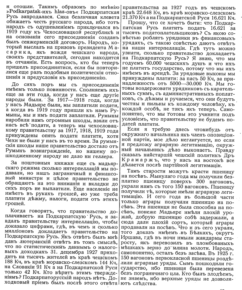 Hohes Haus! Herr Abg. Bergmann hat in seiner eben gehaltenen Rede es als einen Fehler hervorgehoben, daß die anweisenden Behörden sich selbst kontrollieren und er hat betont, daß von einer eigentlichen Kontrolle nicht gesprochen werden kann, wenn sich jemand selbst kontrolliert. Ich möchte dabei daran erinnern, daß wir vor kurzem in den Ausschüssen und hier im Hause ein Gesetz über die Abänderung der Vorschriften der Exekutionsordnung behandelt haben und bei diesen Verhandlungen war sehr viel vom Chabrus die Rede. Das Wort "Chabrus" kehrte in diesen Verhandlungen immer wieder und an diesen Begriff des Chabrus mußte ich mich erinnern, als ich den Entwurf über die Kontrollkommission gelesen habe. Ich mußte mich unwillkürlich an den Chabrus auch erinnern, als ich gehört habe, wie das Budgetprovisorium verhandelt worden ist. Das Wort Chabrus klingt vielleicht etwas schlecht, aber es gibt do ch ein ziemlich genaues Bild über die Gemeinschaft, die charakterisiert werden soll. Zwischen dem Entwurf über die neue Sparund Kontrollkommission und diesem Budgetprovisorium liegt eine gewisse Gemeins amkeit und die Zusammenfassung der Debatte über die beiden Gesetzentwürfe gibt mir Gelegenheit, diesen roten Faden aufzunehmen. Es wurde sehr viel Aufhebens davon gemacht, daß diesmal das Budgetprovisorium angeblich parlamentarisch behandelt worden ist. Wieso? Weil die Majorität dieses Budgetprovisorium nicht wie bisher ganz einfach geschluckt hat - allerdings pflegten mehr oder weniger oppositionelle Reden der Mehrheit auch sonst die Begleitmusik zu bilden - und weil diesmal ein Komitee aus Abgeordneten zusammengetreten ist, das das Budget selbst einer Prüfung unterzogen hat. Die Regierung wußte bei den Ersparungen nicht mehr ein und aus, sie konnte sich nicht helfen, ein wenig hat auch die Energie des neuen Ministerpräsidenten Malypetr beigetragen: Da behandelt man nun das Budget parlamentarisch. Diese parlamentarische Behandlung bestand nun darin, daß sich die Mehrheitsparteien in einem Siebenerausschuß zus ammengesetzt haben und ein Komitee, nicht aber etwa einen verfassungsmäßigen Ausschuß gebildet haben, der Abstriche vorgenommen hat, und nun wurde der Welt die große Errungenschaft einer demokratisch-parlamentarischen Republik verkündet, daß ein Finanzgesetz, ein Etat zustande gekommen ist, wobei auch Abgeordnete hineinreden durften, ohne daß dieses Hineinreden eine von vornherein festgesetzte lediglich platonische Bedeutung gehabt hätte.