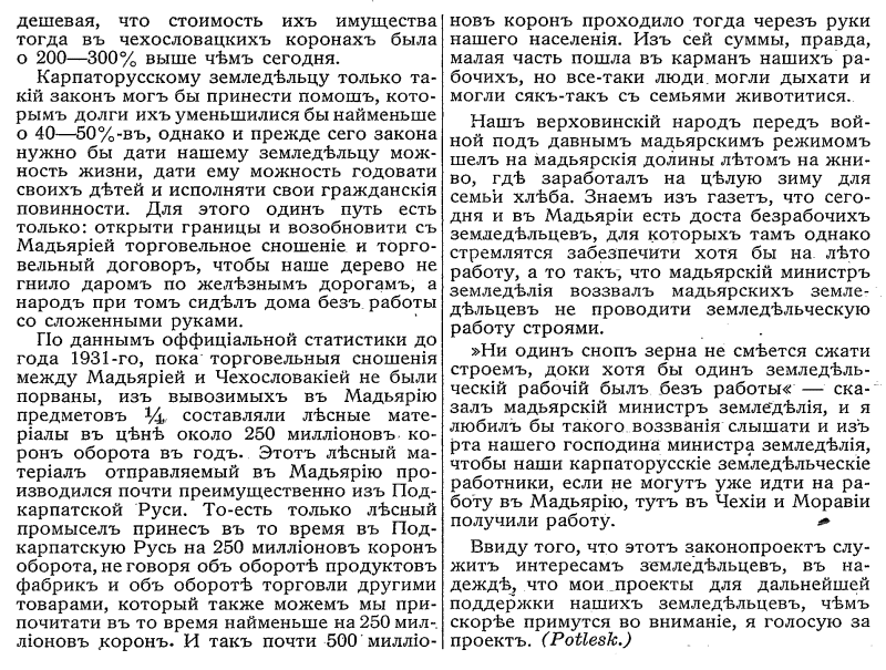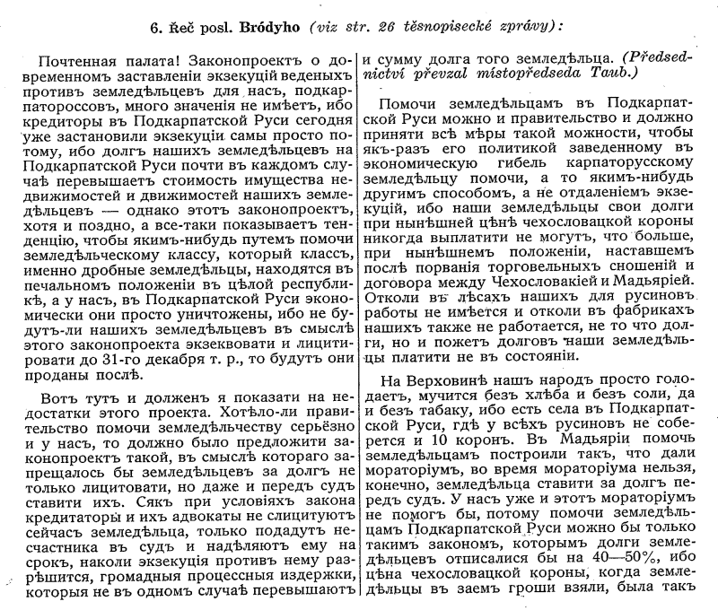 Ich frage, was soll geschehen, wenn ein großer Teil der Landwirte einfach nicht in der Lage sein wird, von dieser "Wohltat" des Gesetzes der Arbeitsanleihe Gebrauch zu machen, weil ihm alle Mittel zur Zeichnung und jedenfalls die Mittel der 75 % zur Zahlung fehlen. So werden wir praktisch folgendes Bild erleben: Der Landwirt wird in kurzer Zeit in einer schlechteren Situation sein als die ist, in der er sich heute befindet. Sowie die Zeichnung der Arbeitsanleihe vorüber sein wird, entsteht die Frage, was mit den Schulden derjenigen geschehen soll, die von den Vorteilen des Gesetzes über die Arbeitsanleihe keinen Gebrauch gemacht haben, einfach deshalb nicht, weil sie nicht konnten, weil sie die notwendigen Barmittel nicht zur Verfügung hatten. Wahrscheinlich wird von neuem eine Flut von Nachlaßgesuchen nach Prag an die bekannte Abteilung 21 kommen und diese Abteilung wird vielleicht nach einer Unterbrechung von einem viertel oder einem halben Jahr vor derselben Situation stehen, vor der sie vor kurzer Zeit zu Beginn der Zeichnung der Arbeitsanleihe gestanden ist.