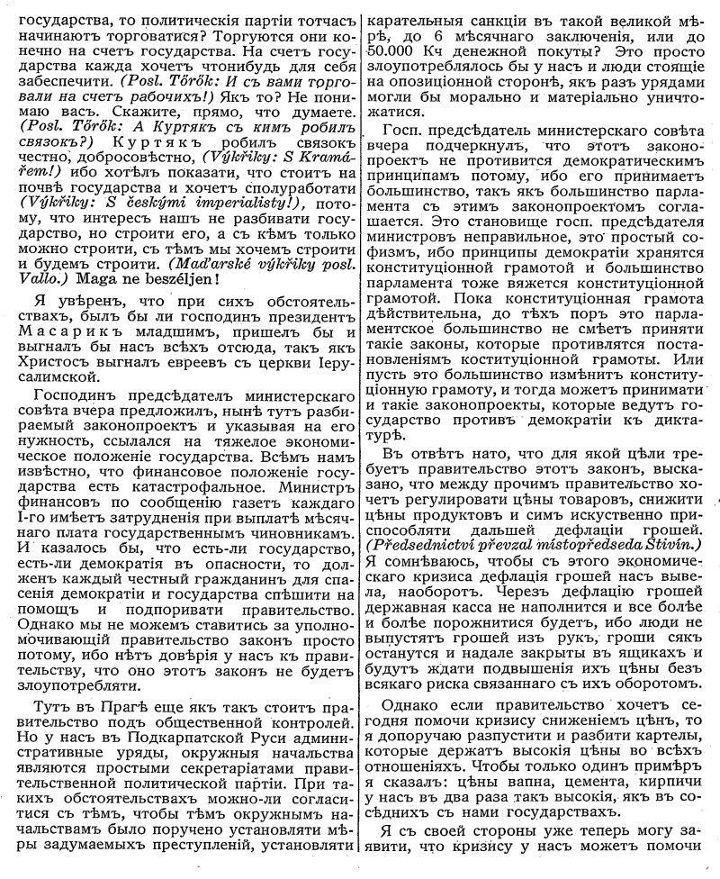 Joga van a diktaturának a múltat egy tollvonással elsöpörni és a parlament szuverén joga által megteremtett törvényeket nullifikálni. Érdekes a dologban, hogy ezt az egész diktaturát a gazdasági szükségesség ártatlan köpenyege alá rejtik. Jó köpenyeg, de itt-ott lyukas és kivigyorog belőle a diktatura erőszakos hatalma. Nevezhetnők demokratikus diktaturának is, "diktatura demokracie"nek is, mert a demokracia látszatát továbbra is meg akarja őrizni a kormányzat. Úgy gondolkozik, hogy jó a demokrácia is, de talán még jobb a diktatura. Hát még együtt! Jó étel a hagyma és a csokoládé is. Hát még, ha együtt tudja valaki enni, csak jó gyomor kell hozzá. (Výkřiky komunistických poslanců.) Például nekem olyan gyomrom nincs mint a kommunistáknak!