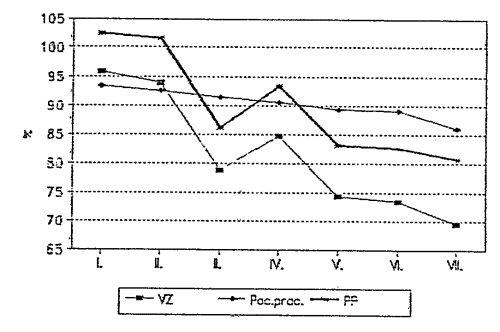 Z řetězového porovnání objemů výroby vyplývá, že k největšímu snížení výroby (vždy proti objemu v předcházejícím měsíci) došlo v dubnu (o 6,2 mld Kčs) a červenci (o 13,1 mld Kčs).