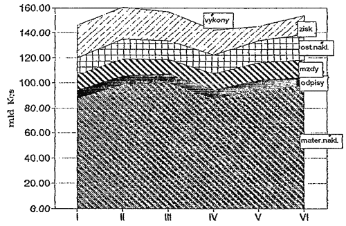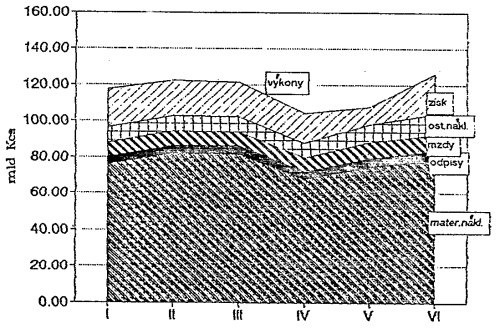 V důsledku postupného odeznívání těchto faktorů a zejména vyčerpáním cenových faktorů růstu výkonů a zisku v průběhu 2. čtvrtletí se tvorba zisku snižovala a ve srovnání s 1. čtvrtletím poklesla o 36,7 %. Přispěl k tomu také pokračující pokles produkce a výkonů, které se ve 2. čtvrtletí oproti 1. čtvrtletí snížily o 5,1 %. Příznivě ovlivňovala vývoj zisku stagnace mzdových a ostatních osobních nákladů na počátku roku a jejich jen mírný nárůst v dalších měsících. Na druhé straně však část mzdových nákladů byla přesouvána do jiných položek nákladů v těch případech, kdy zaměstnanecký vztah byl nahrazen dodavatelským. Výrazný rozdíl mezi růstem výkonů (o 39,9 % v b. c. oproti stejnému období m. r.) a mzdových nákladů (o 2,1 %) vyjadřuje relativní pokles mzdových nákladů a je jedním z faktorů růstu zisku, na druhé straně však i snížení agregátní poptávky. Podíl mzdových nákladů na výkonech vzrostl mezi 1. a 2. čtvrtletím o 14,5 % (v průmyslu o 16,2 %) při snížení výkonů o 5,1 % (v průmyslu o 6,2 %) a růst mzdových nákladů o 8,7 % (v průmyslu o 8,6 %). Vývoj celkového objemu výkonů, struktury nákladů a tvorby zisku v ústředně řízených státních hospodářských organizacích a v průmyslu ukazují grafy.