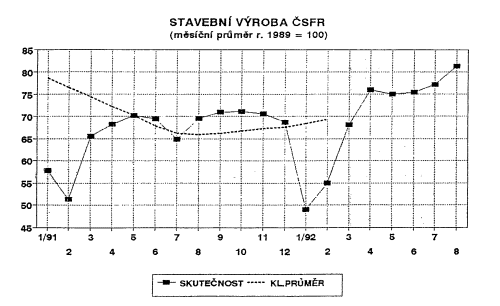 2) Postupné oživování ekonomiky v dosavadním průběhu roku 1992 lze dokumentovat průkazným růstem stavební výroby, jejíž objem za osm měsíců t. r. vzrostl proti stejnému období roku 1991 o 7.9 %.