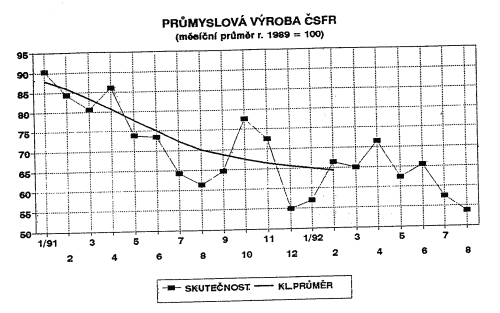 Oživení v odvětví průmyslové výroby je zatím neprůkazné. Vývoj lze charakterizovat snižováním meziročních temp poklesu (celkový objem za 8 měsíců 1992 byl o 18.0 % nižší než ve srovnatelném období 1991).
