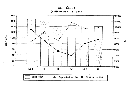 Vývoj GDP ve 3. čtvrtletí zatím nelze hodnotit pro nedostatek údajů. V průběhu 1. pololetí se velikost GDP stabilizovala přibližně na úrovni 2. pololetí 1991. Čtvrtletní řetězové indexy růstu se již pohybují kolem 100 %. Meziroční srovnání 1. pololetí se stejným obdobím minulého roku stále ještě ukazuje pokles o 13.0 %, jde však o efekt srovnávací základny (poklesy objemů GDP v předchozím roce). Meziroční snížení objemu GDP ve stálých cenách lze odhadnout v rozmezí 9 - 11 %.